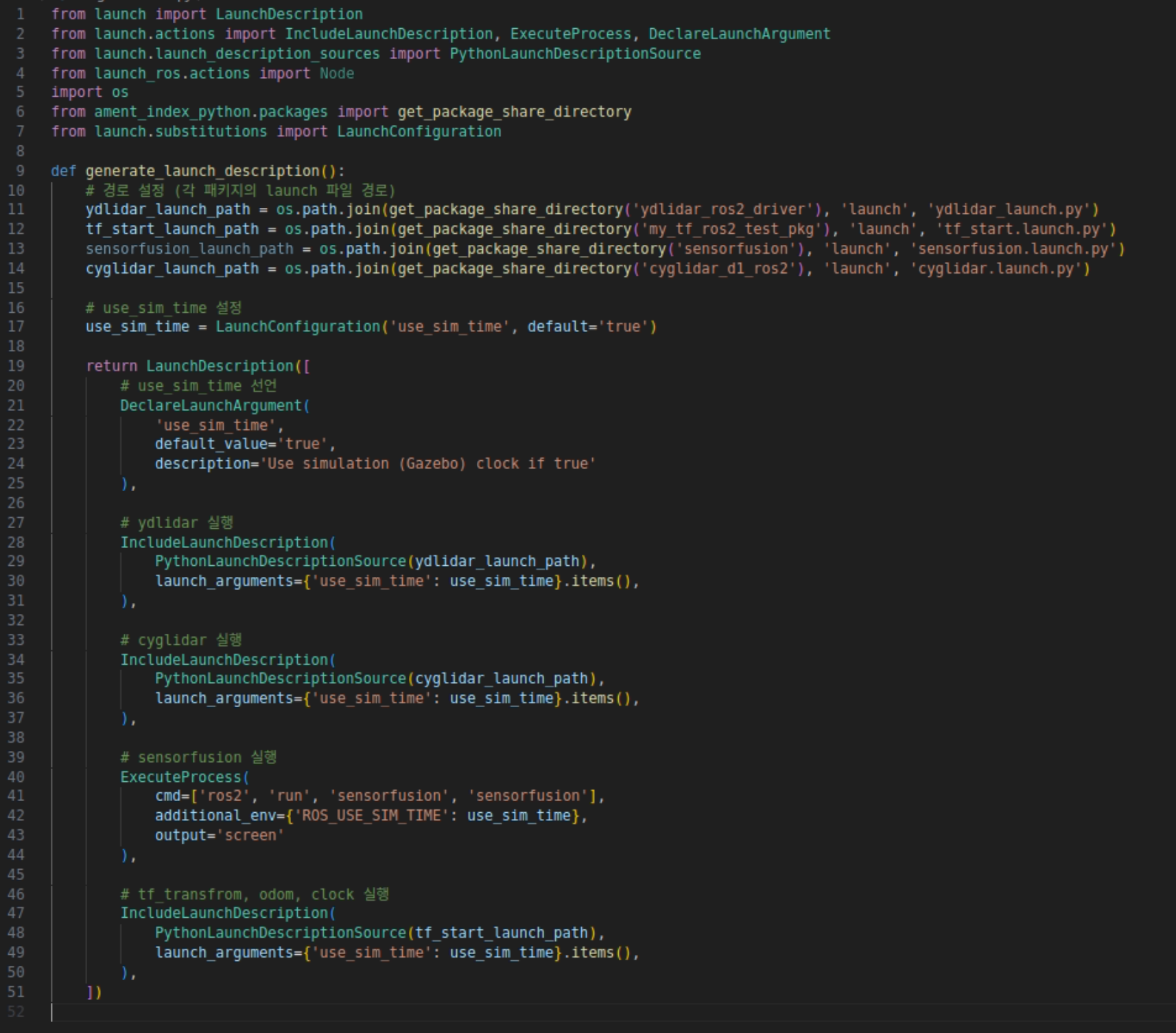 - IncludeLaunchDescription : PythonLaunchDescriptionSource 를 통해 다른 런치 파일을 불러오고 그 launch 파일 또한 현재의 launch 파일이 실행될때 실행될 수 있도록 하는 것