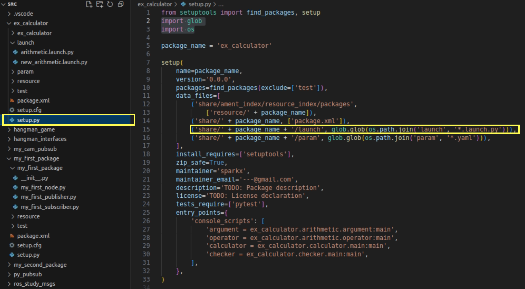 이제 파일을 생성했다고 끝나는 것이 아니라 생성한 launch 파일을 인식할 수 있도록 setup.py에서 코드를 추가해줘야한다.