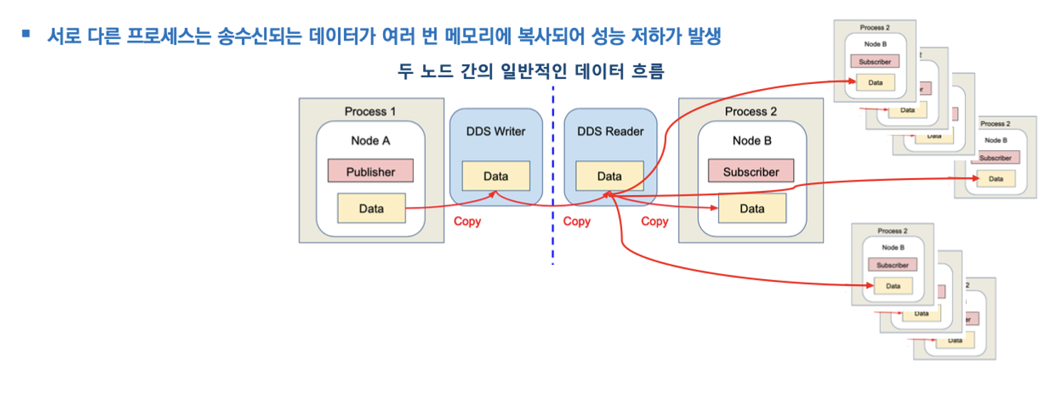 - 이 과정에서 여러 번의 메모리 복사가 발생한다.(구독 노드가 3개라면 3개의 메모리 복사) 특히 대용량 데이터(이미지, 라이다 데이터 등)을 전송시 메모리 사용량 증가와 성능 저하로 이어질 수 있다.